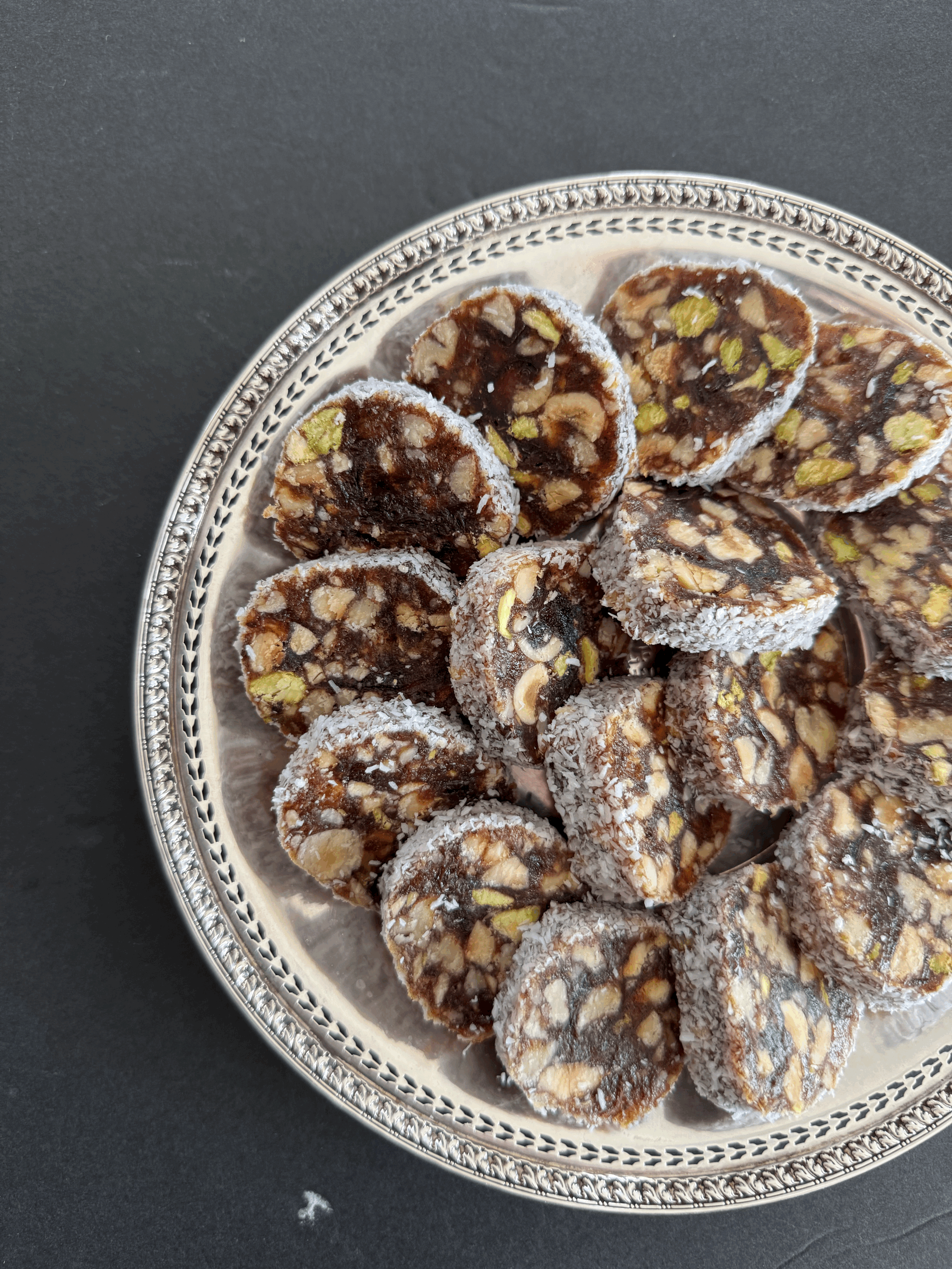 Image 1 of 1 Date Roll- PARVE $38.00 Per DozenParveDate Roll filled with Pistachios, Hazelnuts and Pecans Add To Cart Added! Per DozenParveDate Roll filled with Pistachios, Hazelnuts and Pecans